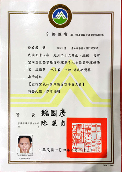 祝賀靖江酷爾比特機(jī)械有限公司臺(tái)灣總公司施政君先生獲得《室內(nèi)空氣品質(zhì)維護(hù)管理》專員資質(zhì)